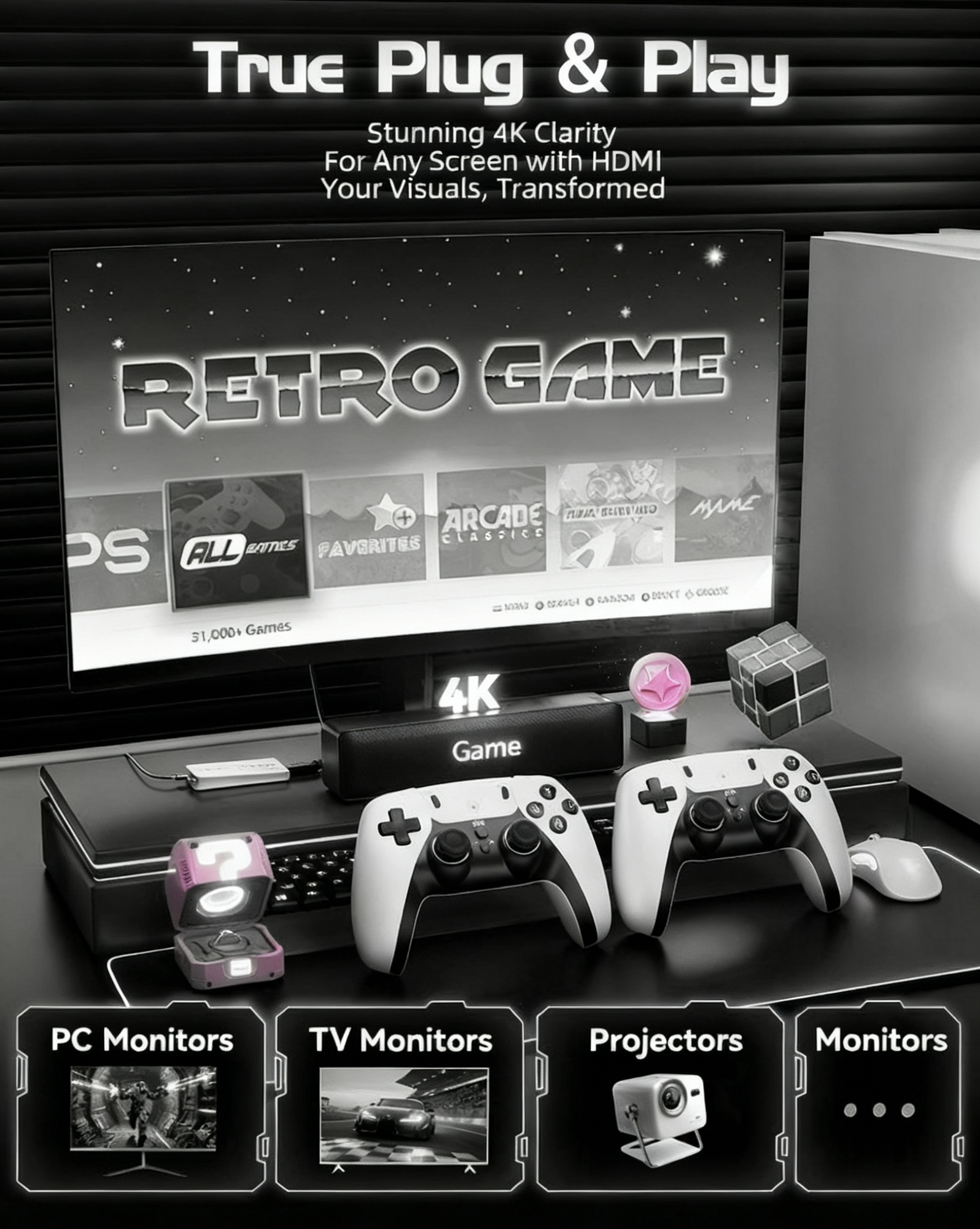 Turn any screen into a retro arcade with the Retrosonic V4 - your all-in-one gateway to classic gaming. Simply plug it into your TV, PC monitor, or projector, and you’re ready to relive the golden age of gaming in seconds.